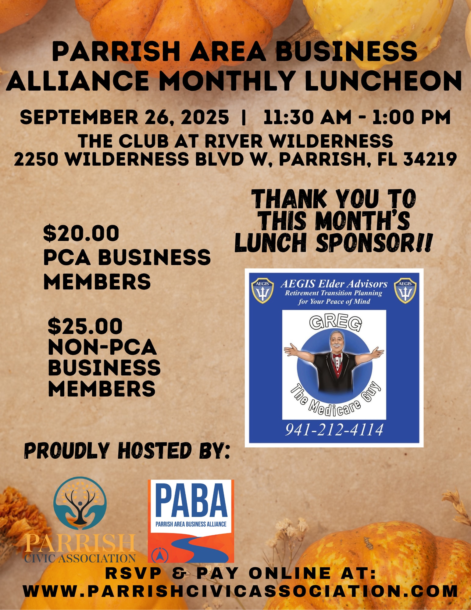 The Parrish Area Business Alliance’s meets on the last Thursday each month. (With the exception of July and November.) The fee for our networking lunch is $20 for PCA Business Members and $25.00 for Non-PCA Business Members. Our Luncheons are held at The Club at River Wilderness, 2250 Wilderness Blvd W, Parrish FL 34219 From 11:30 am to 1:00 pm